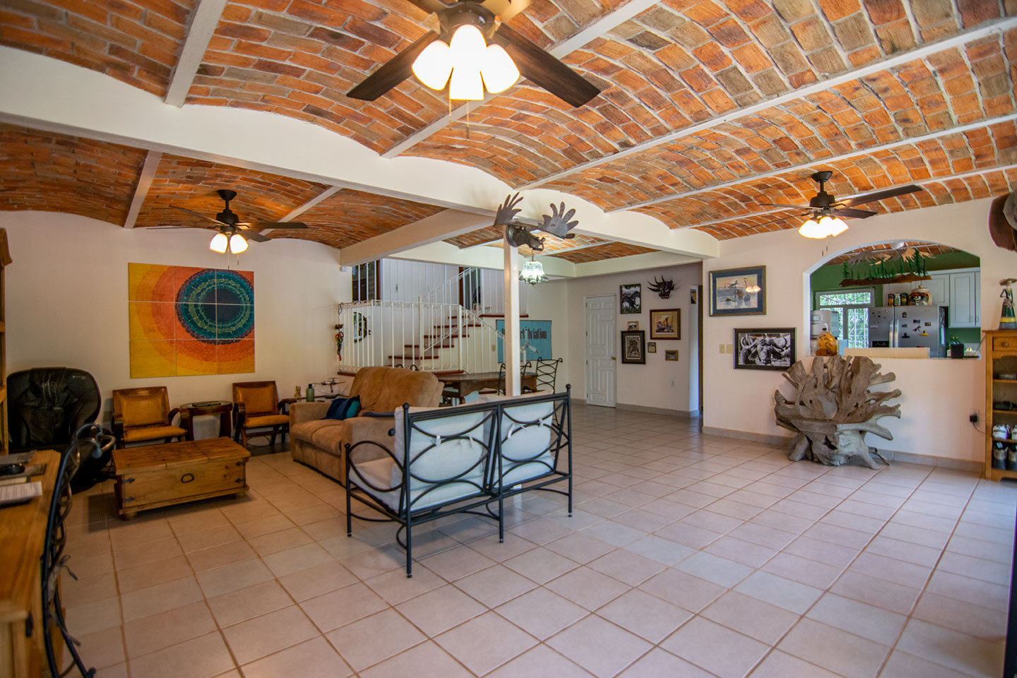 Upon entering the home, you’re immediately welcomed into the enormous, light-filled great room, featuring boveda ceilings, a cozy corner fireplace and leading out to the view terrace overlooking a charming arroyo. More than just beautiful, the arroyo can never be developed, guaranteeing your neighbors will always be trees.