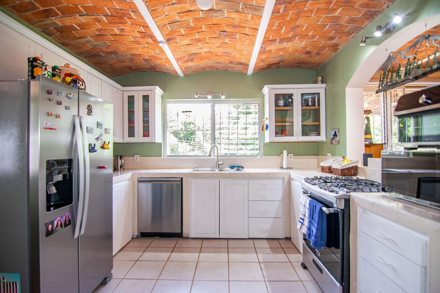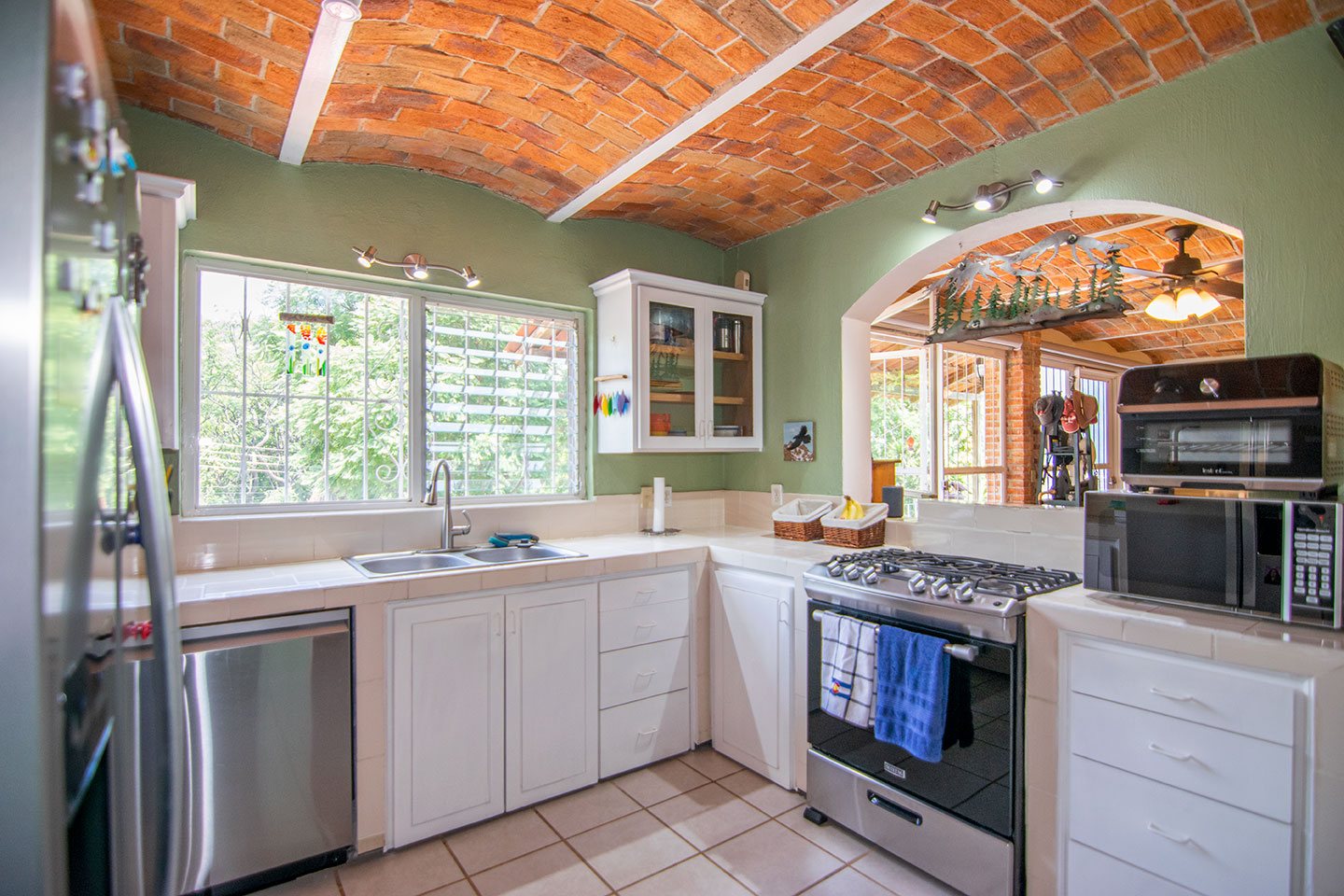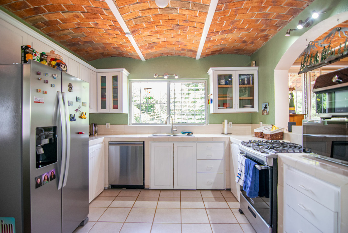 Junto a la sala principal se encuentra la espaciosa cocina. Cualquier diseñador de cocinas reconocerá y apreciará de inmediato la distribución triangular ideal, con el fregadero en el centro y el refrigerador y la estufa a cada lado. Este diseño, combinado con la abundancia de gabinetes y encimeras, hace que preparar sus comidas sea un placer.